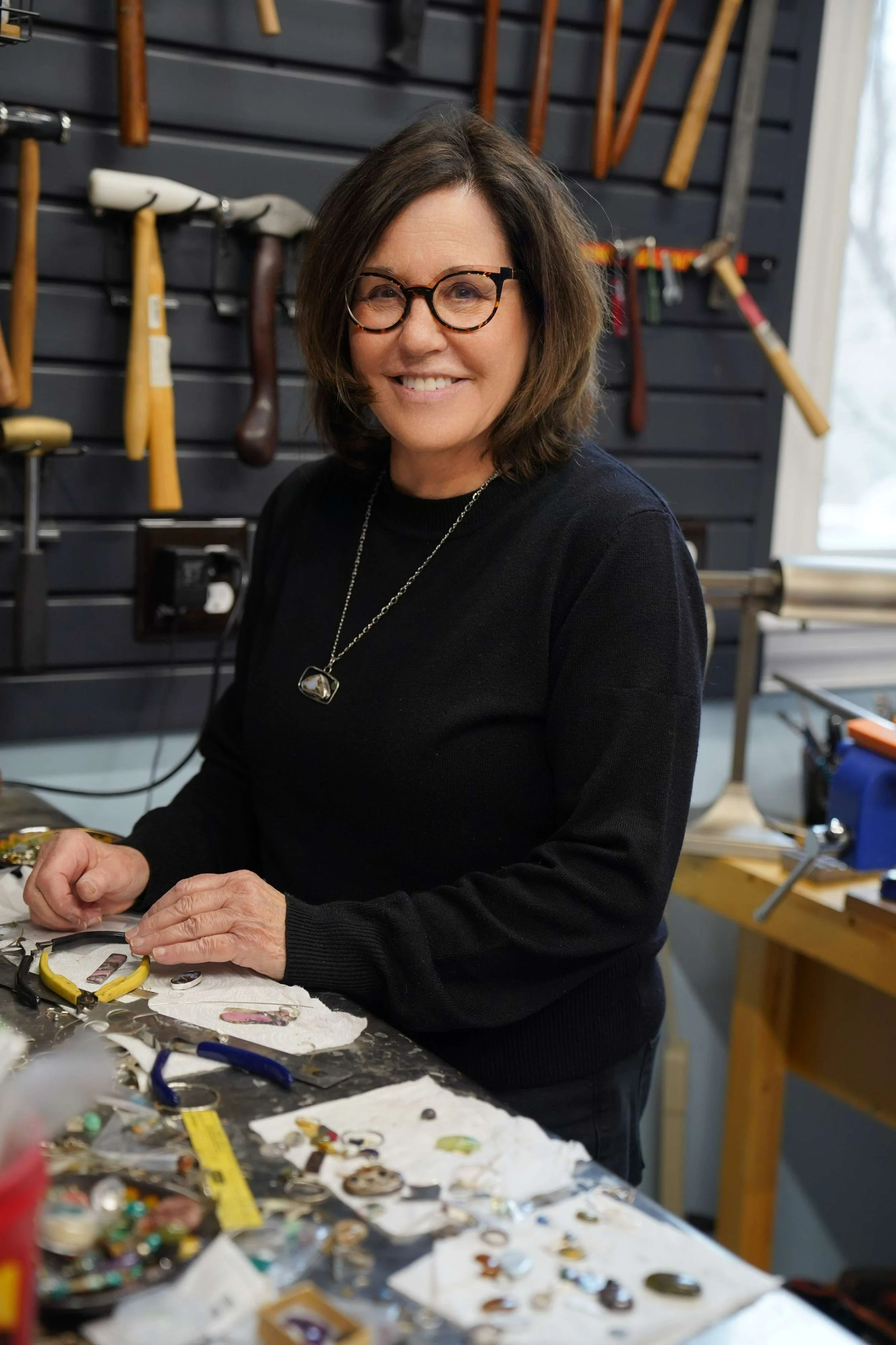 Jill’s artistic journey involves sourcing unique gemstones from around the world, carefully selecting each one to inspire her designs. She pairs these beautiful stones with intricately crafted silver adornments, which she painstakingly creates through techniques like hand-sawing, soldering, and texturing. Her process begins with detailed sketches, followed by shaping the metal to frame the gemstones perfectly. Each step requires precision and creativity, from forming the silver to polishing the final piece, ensuring that every design is both striking and personal.